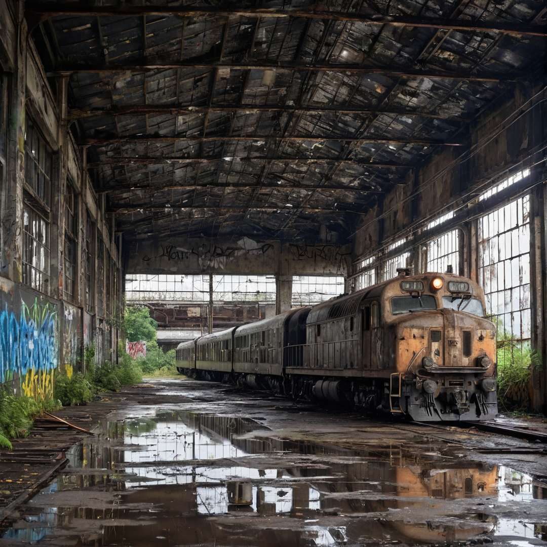abandoned train depot with leaking roof, large puddles on the cracked concrete floor, rusted electric locomotives from the 1970s covered in dust and graffiti, wet metal surfaces reflecting dim natural light, broken overhead lighting, shattered windows letting in grey daylight, overgrown vegetation creeping inside, photorealistic, high detail, moody atmosphere, water dripping from ceiling, cinematic composition, ultra-realistic, 35mm lens, depth of field, wet surfaces, HDR, sharp textures, damp smell vibe