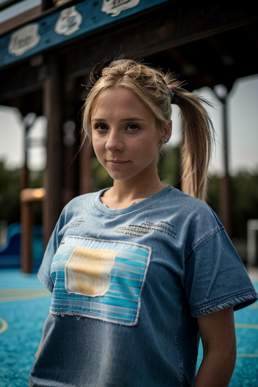 jeans, Sea Blue tshirt in a playground, <lora:Sarah_Jane_Honeywell:1> masterpiece,best quality, detailed face, 1girl, solo, sj1873h, blonde_hair, pony tail