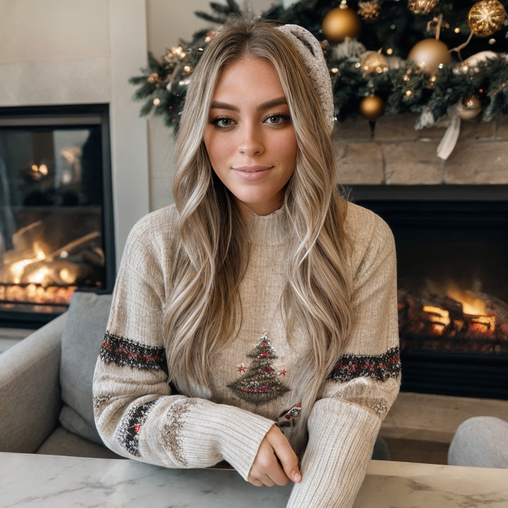 <lora:qtcinderella_sd15_512_128_64_v1:1> qtcinderella, 1girl blonde long weavy hair, wearing a christmas sweater, christmas decoration in background, lit fireplace in background