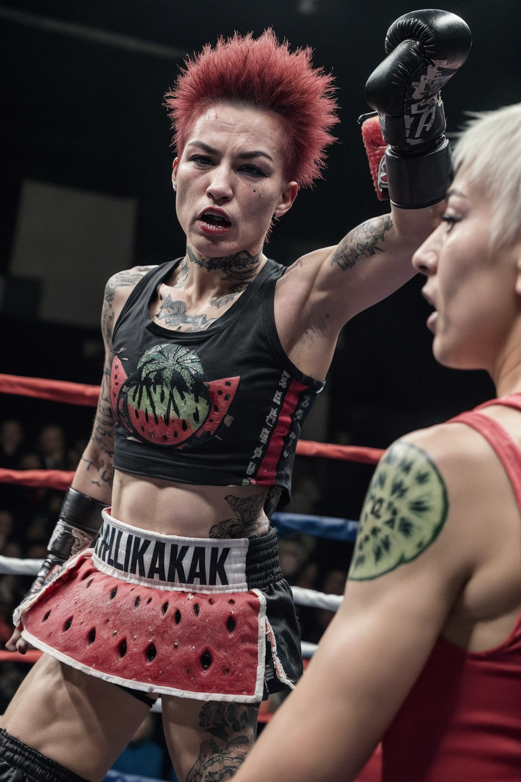 2female punk boxing, (wearing punk clothes, punk fashion), (2 brutal punk women fighting at boxing ring), inspired by Kabuki, (watermelon is their trademark:1.4), initial impulse, destructive impulse, destroyism, no future, anarchism, god save the queen, irony, (cross counter:1.3), women become punch-drunk, fighting for punks pride, they are serious, snapshot, full body, masterpiece, best quality, extremely detailed, crisp image, sharp image, clear image, vivid image, realistic image, noiseless image, detailed face, detailed eyes, detailed hair, highly detailed background, natural cinematic lighting,