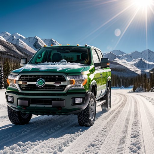 a bright green truck is driving on a snowy road, it is snowing, the sun is shining brightly, there is a frozen lake and snow-capped mountains in the background, high quality, masterful image, high detail, photography, realistic image