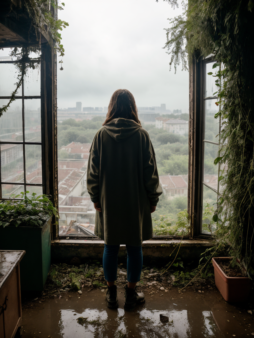 RAW photo, young european girl standing (back to the viewer) in front of a (desolated, moos overgrown dormitory)) in ((dismaying apocalyptic overgrown city)), plant covered crumbling houses, overgrown traffic lights, destroyed cars full of plants, and a ghostly figure appearing in the window ((night light, storm, rain)), (high detailed skin:1.2), 8k uhd, dslr, soft lighting, high quality, film grain, Fujifilm XT3
