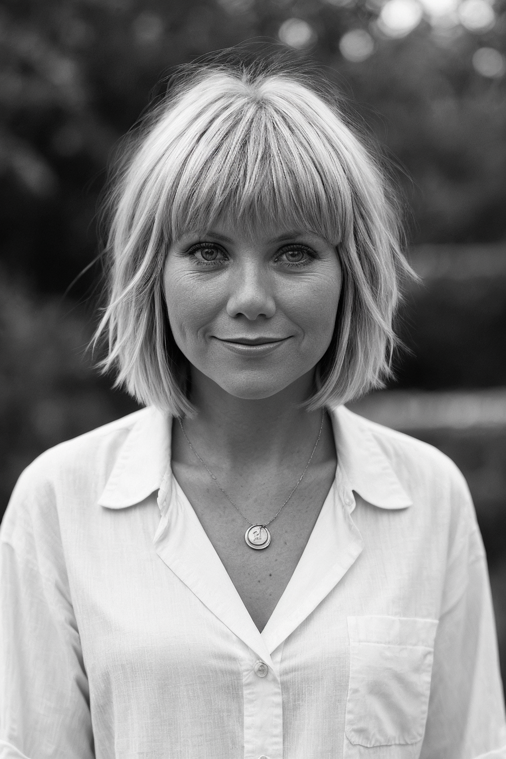 glynisbarber, woman, 1girl, looking at viewer, smile, short hair, bangs, jewelry, monochrome, upper body, greyscale, medium hair, button-down shirt, necklace, blurry, depth of field, blurry background, realistic <lora:GlynisBarberSD:0.8>