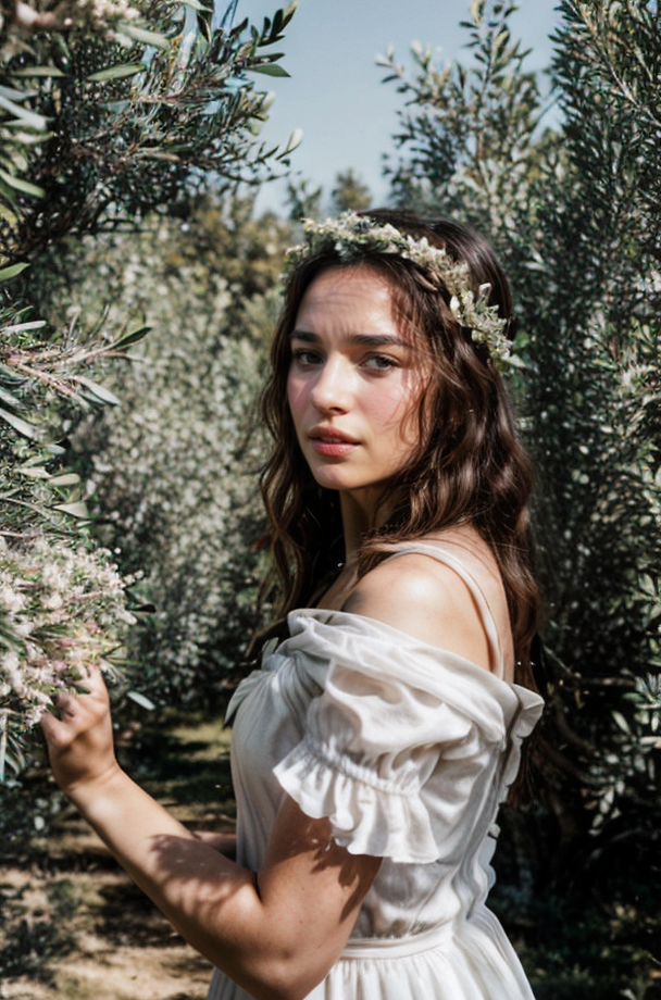 RAW photo,strafed woman in a white dress,((worried and sad)),olive branch on head, olive grove, elegant ancient greek dress, ancient white dress, emilia clarke as a greek goddess, margot robbie as a greek goddess, emma watson as a greek goddess, inspired by Theophanes the Greek, ancient greek style,8k uhd, dslr, soft lighting, high quality, film grain, Fujifilm XT3 <lora:InstantPhotoX3:0.6> <lora:more_details:0.6> <lora:emotions_lora:0.6>