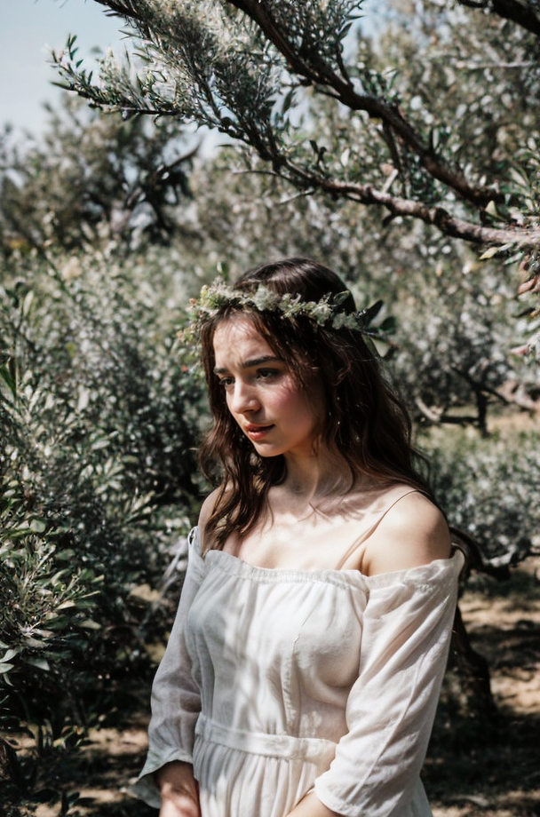 RAW photo,strafed woman in a white dress,((worried and sad)),olive branch on head, olive grove, elegant ancient greek dress, ancient white dress, emilia clarke as a greek goddess, margot robbie as a greek goddess, emma watson as a greek goddess, inspired by Theophanes the Greek, ancient greek style,8k uhd, dslr, soft lighting, high quality, film grain, Fujifilm XT3 <lora:InstantPhotoX3:0.6> <lora:more_details:0.6> <lora:emotions_lora:0.6>