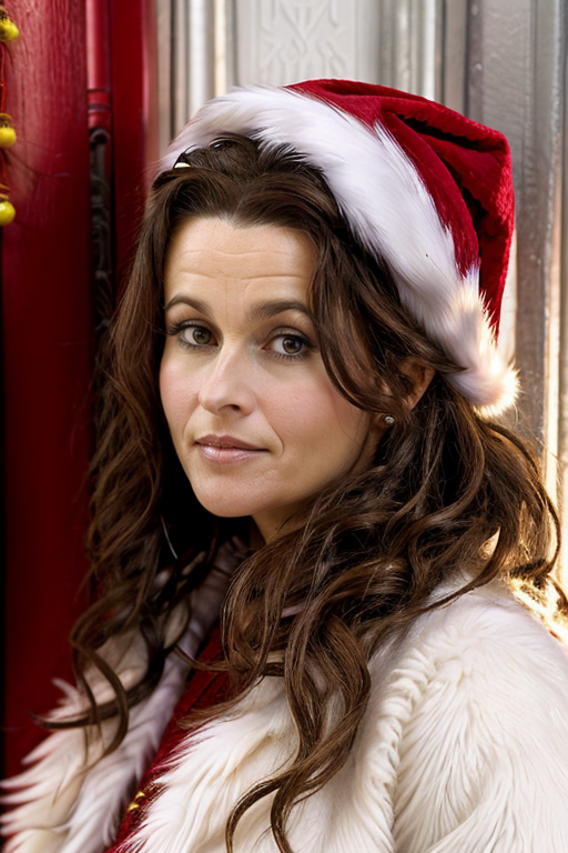 mrs santa claus, santas grotto, north pole, elves, snowmen, candy canes, snow, icicles, <lora:Helena_Bonham_Carter:1> 1girl, solo, a mature 40 year old hb1873c, brown hair, wavy,messy,up do, hair, masterpiece,best quality, detailed face