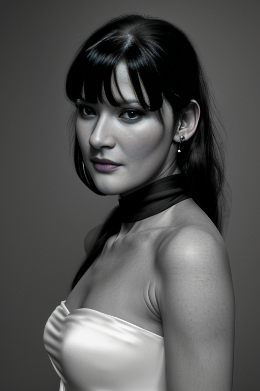 gr3tch3nm01, long hair, (jet black hair with bangs:1.4), strapless evening gown, (silk scarf:1.3), earrings, (high fashion:1.5), indoors, museum, <lora:Gretchen_Mol_PMv1_Lora:1.3>,, detailed skin texture, (blush:0.5), (goosebumps:0.5), subsurface scattering, (b&w, Monochromatic, Film Photography:1.3), Photorealistic, Hyperrealistic, Hyperdetailed, film noir, analog style, soft lighting, subsurface scattering, realistic, heavy shadow, masterpiece, best quality, ultra realistic, 8k, golden ratio, Intricate, High Detail, film photography, soft focus, ((Full-Body Shot))