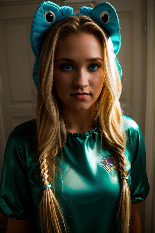 wearing a dinosaur costume <lora:Emily_Osment:1> e1873o, 1girl, solo, long_hair, blue_eyes, blonde_hair