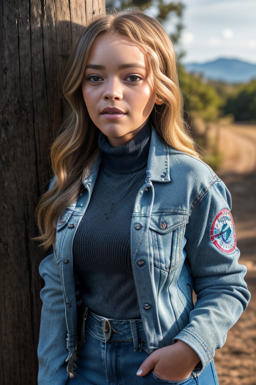 (RAW, analogue, Nikon Z 14mm ultra-wide angle lens, award-winning glamour photograph, ((best quality)), ((masterpiece)), ((realistic)), skin pores, subsurface scattering, radiant light rays, high-res, detailed facial features, high detail, sharp focus, smooth, aesthetic, extremely detailed, (extremely detailed eyes, extremely detailed iris), extremely detailed hair, extremely detailed skin, extremely detailed clothes, octane render, photorealistic, realistic, post-processing, max detail, realistic shadows, roughness, natural skin texture, real life, ultra-realistic, photorealism, photography, 8k UHD, photography, hdr, intricate, elegant, highly detailed, sharp focus, stunning, beautiful, gorgeous), (photorealistic), (realistic), j4d3p3ttyj0hn, full body, blonde hair, blue, eyes, (denim jacket:1.3), (black turtleneck sweater:1.1), jeans, lips, long hair, outdoors, on a ranch, leaning on a wooden post, looking at viewer, upper body, morning, bright, photorealistic, realistic, detailed eyes, intricate face, high contrast, <lora:Jade_Pettyjohn_PMv1_Lora:1.3>,