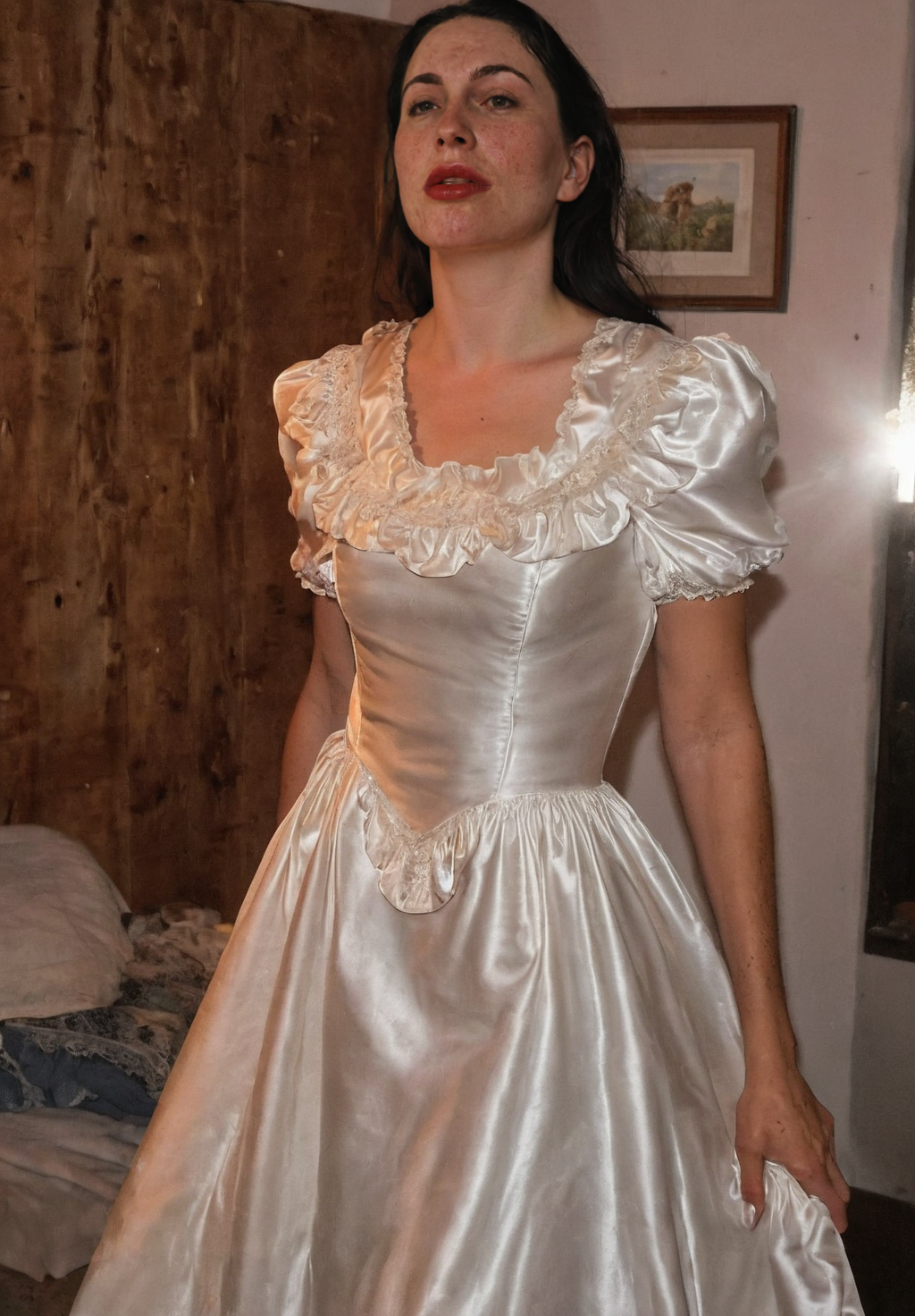 Michaela is a thick white woman, Michaela has white skin, big lips, Michaela wears satin wedding dress from ebay, satin nightgown, close-up photo of Michaela stands three-quarter side view, thick arm, full detailed face, oblong face, fake cheeks, sweating face with coily black hair, morning crust, Wrinkled loose skin with pores, Velvety, skin moles, Mature skin, lipstick, RAW photo with a dark photo,high contrast photo, high detailed photo, 4K, texture, Camera RAW, direct light night, mid-night. seductive, atmosphere. detailed background and sharp and detailed, film grain. masterpiece, best quality, amazing quality, newest, highres, high resolution, ultra-detailed, high contrast, cowboy shot, dynamic pose, Detailed natural skin and blemishes without-makeup,