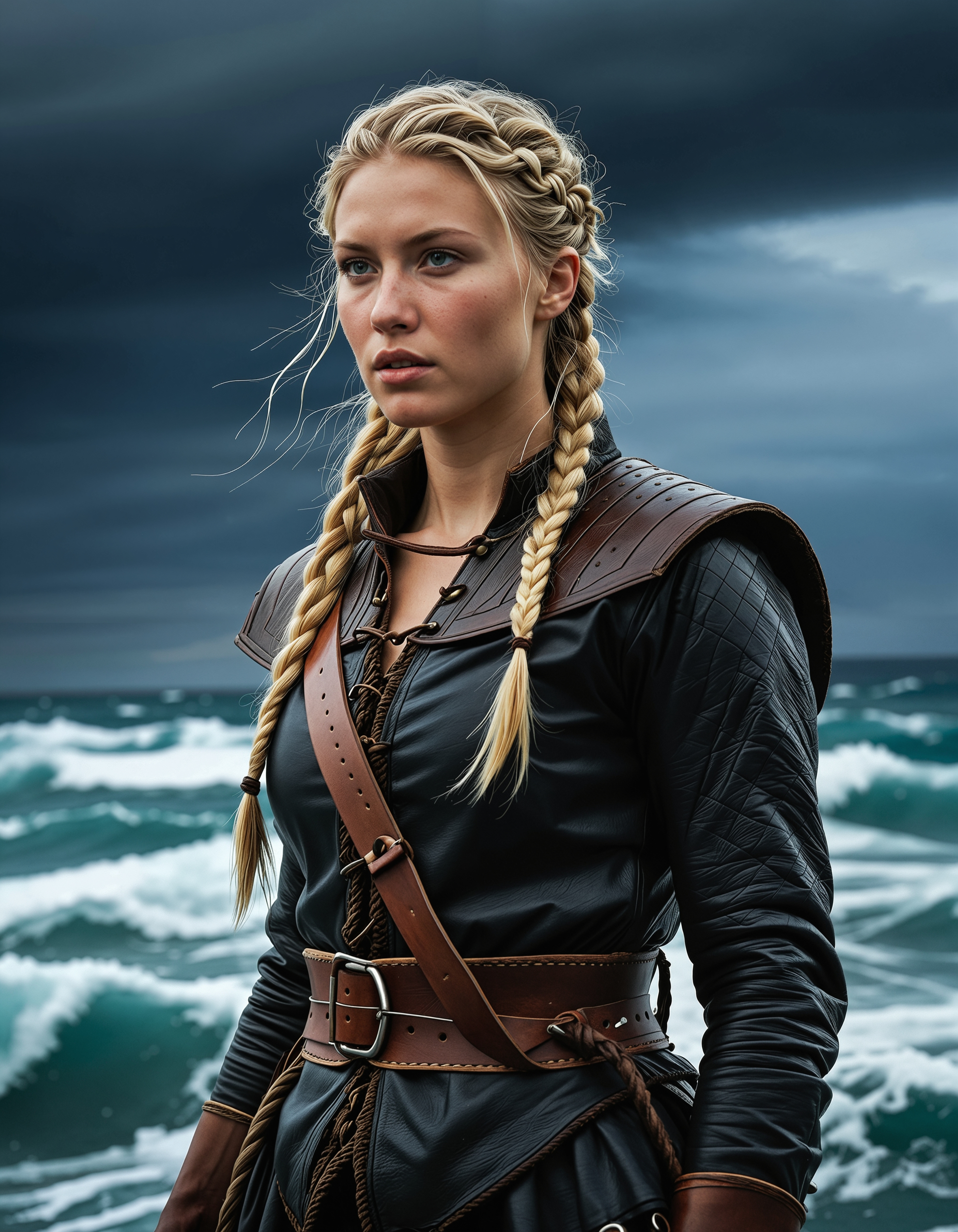 RAW full body image of a gorgeous 25 years old Gorgeous Viking Woman blond, braided hair, <lora:NordicByNature:0.8>,Stormborn Explorer, A Viking woman navigating rough seas in a longship, her leather,clad form bracing against the raging storm overhead.,low light, soft natural light, Rembrandt style light, Hasselblad DLSR camera, 200mm Zeiss lens, f/2.8 clear focus, high resolution image, (soft naural light), (rembrandt light), (soft shadows) ,Sexy pose, erotic pose, exhibitionism,