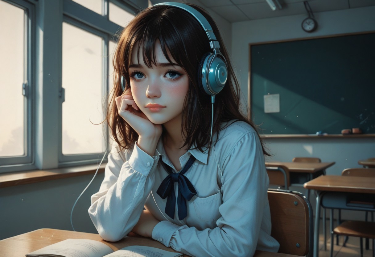 1anime girl ,sitting, alone, classroom, at night, wearing headphones, soft lighting, shy face, vintage school setting, simple background, Makoto Shinkai style