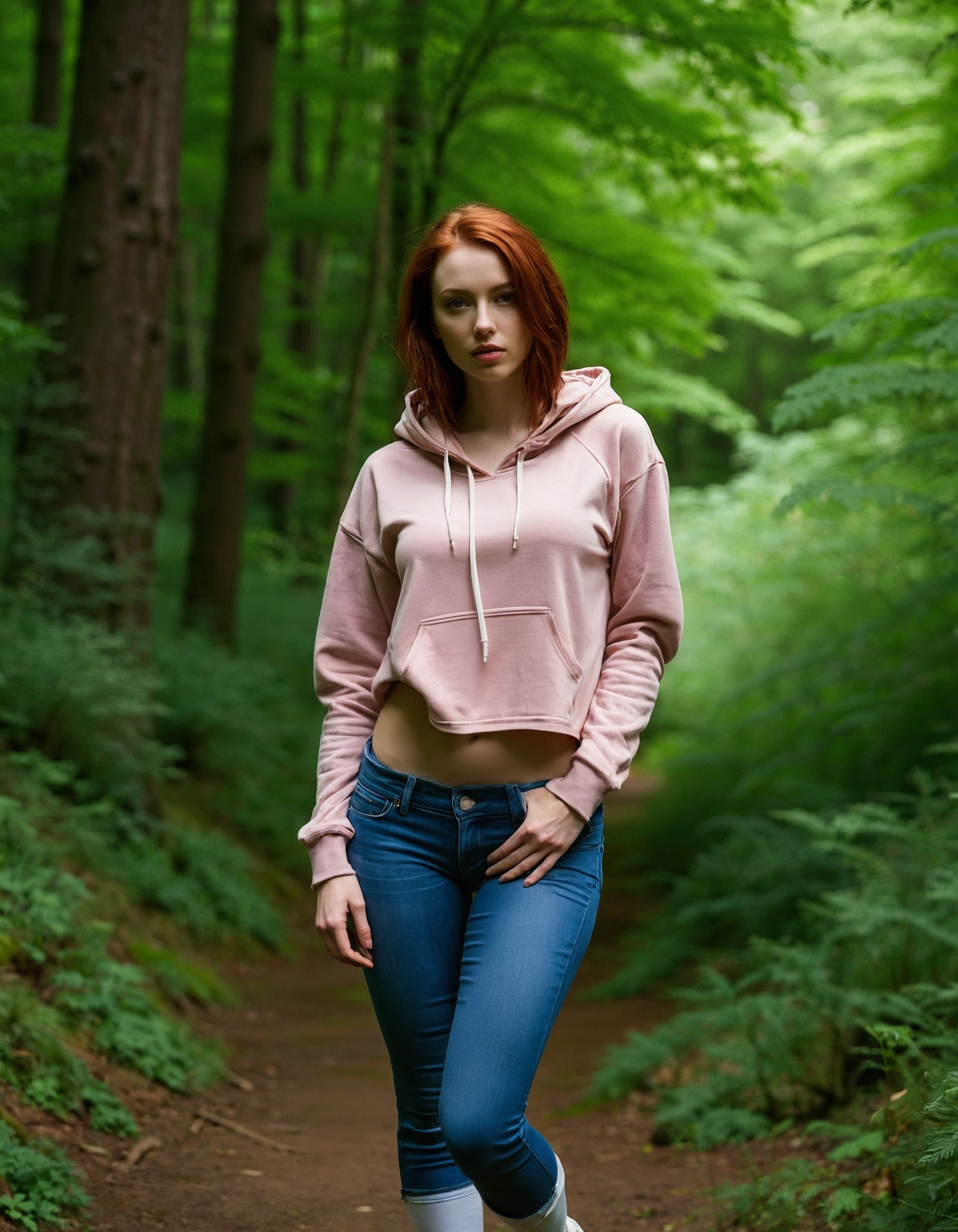 RAW full body analogue photo of a beautiful 25 years old woman, clear focus, high resolution image,,perfect face, sexy pose, wearing dusty rose hoodie with high-waisted jeans and white sneakers, perfect eyes, detailed eyes, detailed iris, realistic skins absolute perfect tits, soft tits, natural tits, ,low light, soft natural light, Rembrandt style light, Hasselblad DLSR camera, 200mm Zeiss lens, f/2.8, ,Sexy pose, erotic pose, exhibitionism ,Enchanted forest
