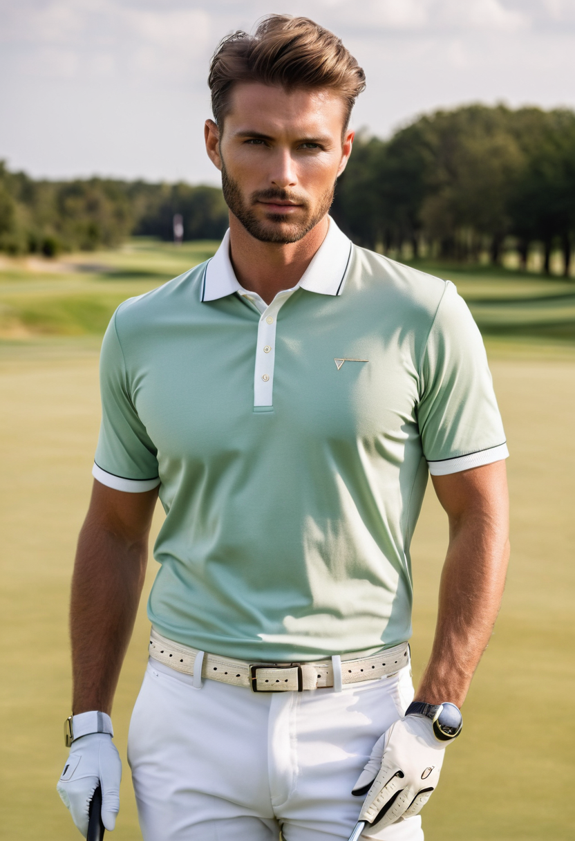 raw photo, half body, beautiful man, 30 years old, Classic Fashion, plays golf, luxurious outfit