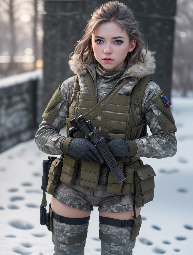 (photorealistic), beautiful lighting, best quality, realistic, full body portrait, real picture, intricate details, depth of field, 1girl, in a cold snowstorm, A very muscular soldier girl with haircut, wearing winter camo military fatigues, camo plate carrier rig, combat gloves, (magazine pouches), (kneepads), highly-detailed, perfect face, blue eyes, lips, wide hips, small waist, tall, make up, tactical, Fujifilm XT3, outdoors, bright day, Beautiful lighting, RAW photo, 8k uhd, film grain, ((bokeh))