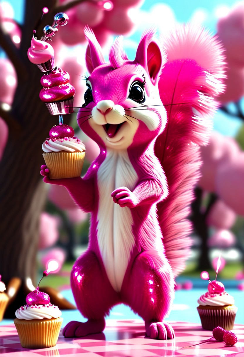 hyperactive squirrel made of pink l1qu1dp34rl with chrome tail, launching cupcakes from a tree bazooka, surreal sugar chaos, cartoon sparkle energy