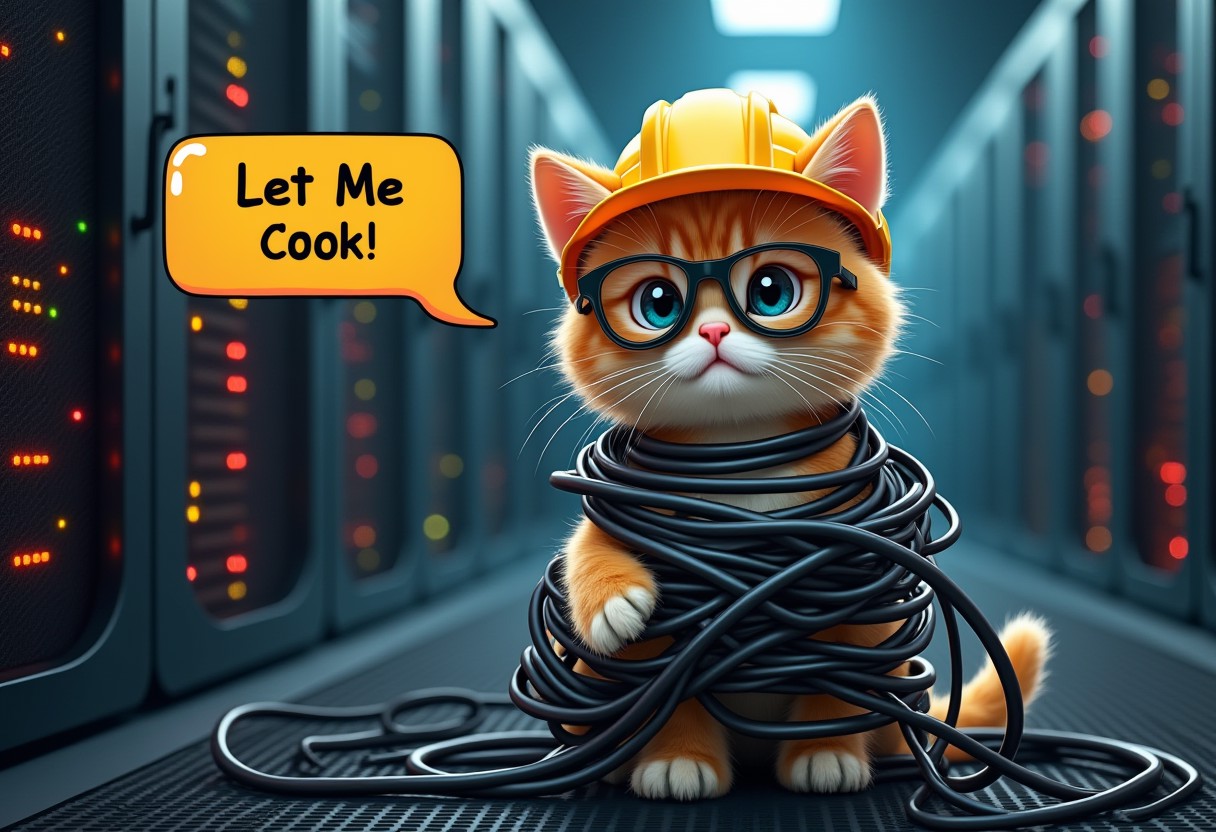 realistic picture of a cute kitty with security glasses and a yellow hard safety hat looking into the camera wrapped in network cables and a holding a ball of wires in his paws, sitting atop a pile of wires plugged to server racks and a mess of wires hanging in the back, inside a datacenter server room with red, yellow and green led lights blinking in the server racks in the background, a cartoon text bubble floating beside the kitty with the text "Let Me Cook!"