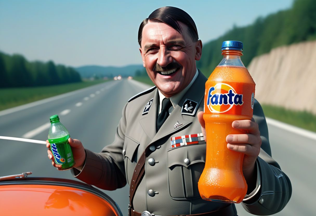 Smiling Adolf Hitler holding a fanta bottle, on a german highway with a WV beetle, <lora:Adolf-Diffusion2:0.7> adolfhitler <lora:CokeGirls:1> advertisement, Fanta, High quality, realistic, UHD, 8K