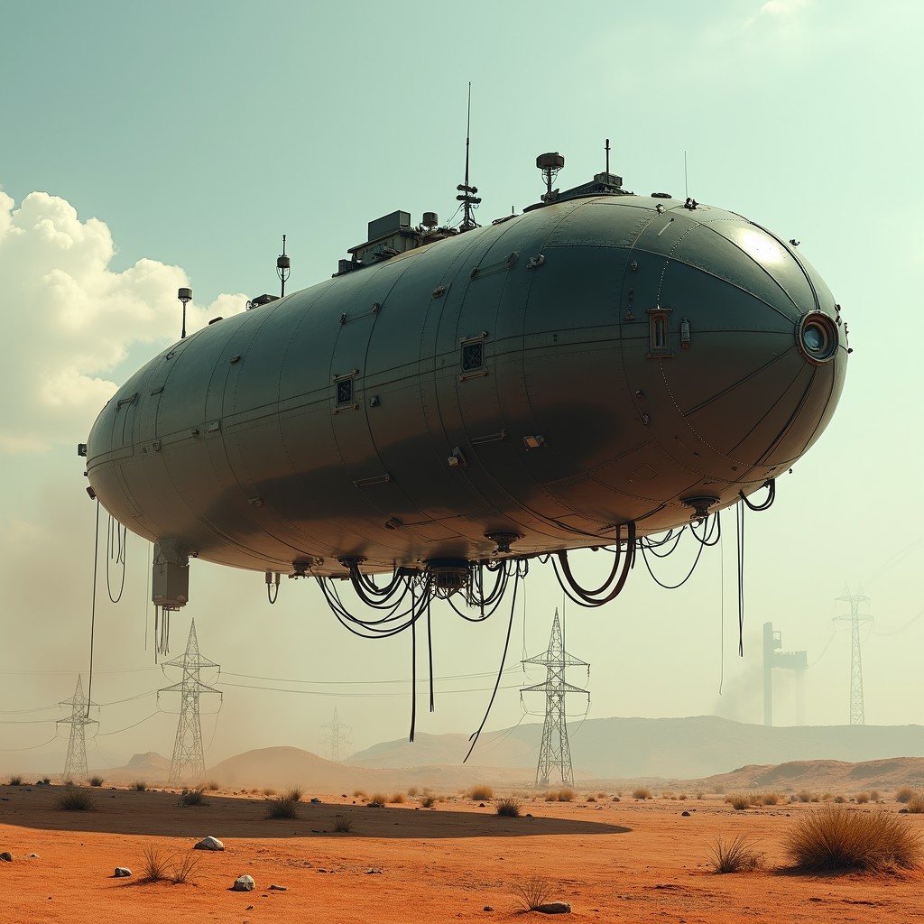 ultra high resolution, masterpiece, best quality, small featureless glossy black spacecraft with a textured surface hovering low to the ground, underneath the spacecraft are cables hoses and wires, antennas on top, cables hanging from below, rectangular in shape, futuristic world, post apocalyptic landscape, ((low concrete buildings:1.3)) anti gravity, in the atmosphere, sky, clouds, ground visible, hovering, dry, ((dusty)), bleak landscape, parched, orange light, sunlight, square shapes, bleached colors, scattered destroyed industrial buildings, powerlines and towers