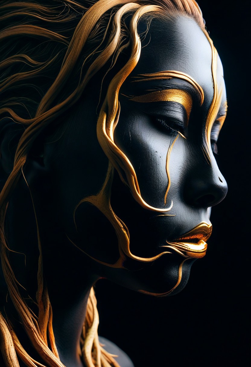 PG-TR,(film grain),ultrarealistic 4k,photoart_style, vivid, minimalist, beautiful black face, golden make-up,side view profile,realistic, Wide angle lens, high contrast, dark black tone,Cinematic Lighting, movie-level texture, hand-painted details, epic, meticulous,perfect composition, dynamic play of light, rich colors, epic shot, perfectly quality, natural textures,high detail, photoshadow, (natural colors, correct white balance, color correction, dehaze),(intricate detailed), YurYuna