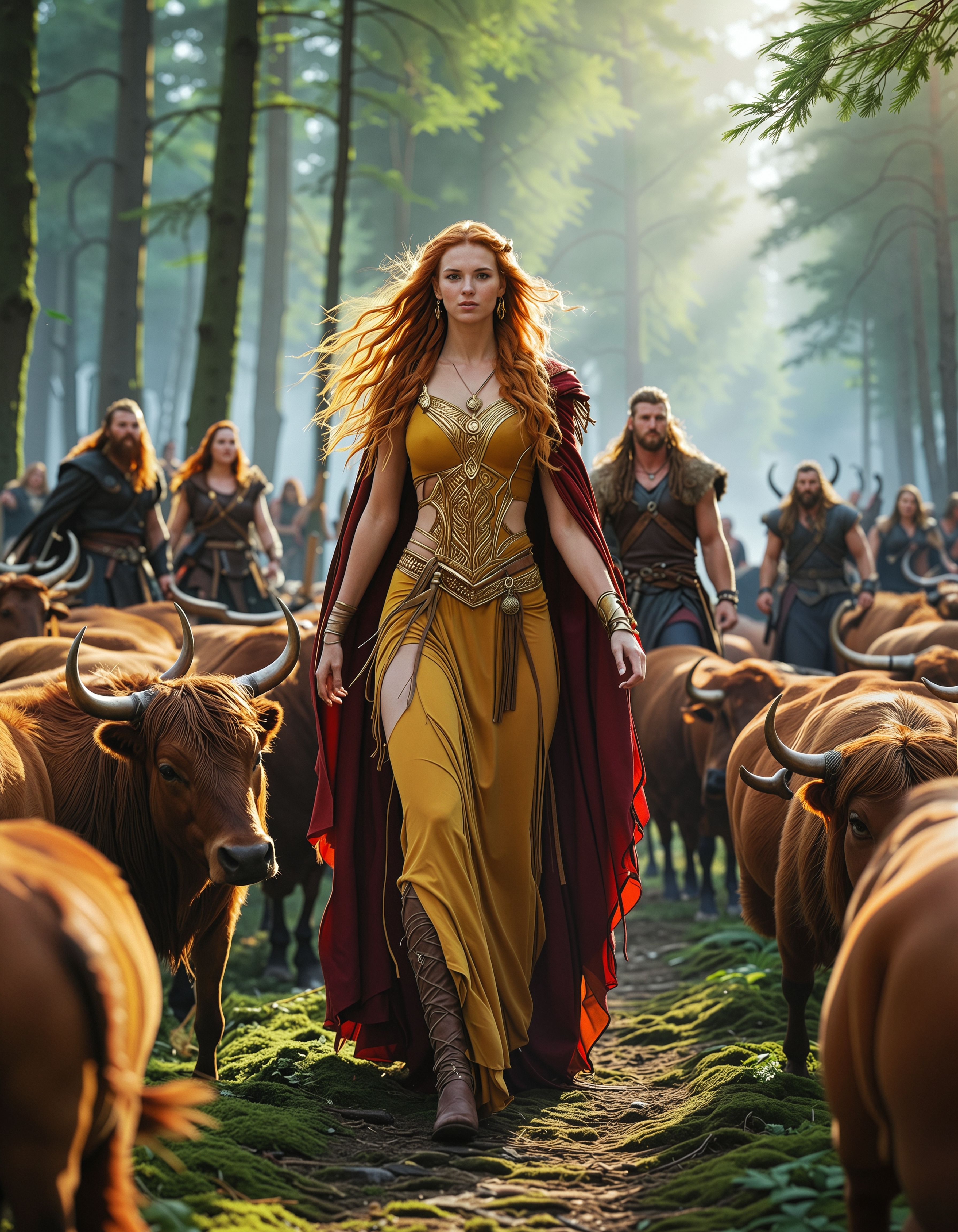 freyja, auburn hair, braided hair, magic, forest, viking queen, mythic beauty, <lora:NBN-Freyja_NordicByNature:0.8>, <lora:NordicByNature:0.8>,nbn-freyja in a Mead Hall, A strong, confident woman raising a drinking horn in a grand longhouse, surrounded by warriors celebrating a victorious raid.,high quality, film grain, Fujifilm XT3, 8k uhd, dslr, film grain, kodak tri-x 400 film, grain photo DOF, faint lighting, dynamic angle, cinematic, Depth of field, bokeh, best quality, cinematic, light particles, highly_detailed, very_aesthetic, golden hour, beautiful_and_aesthetic clear focus, high resolution image, ,Sexy pose, erotic pose, exhibitionism, ,tropical fruit market