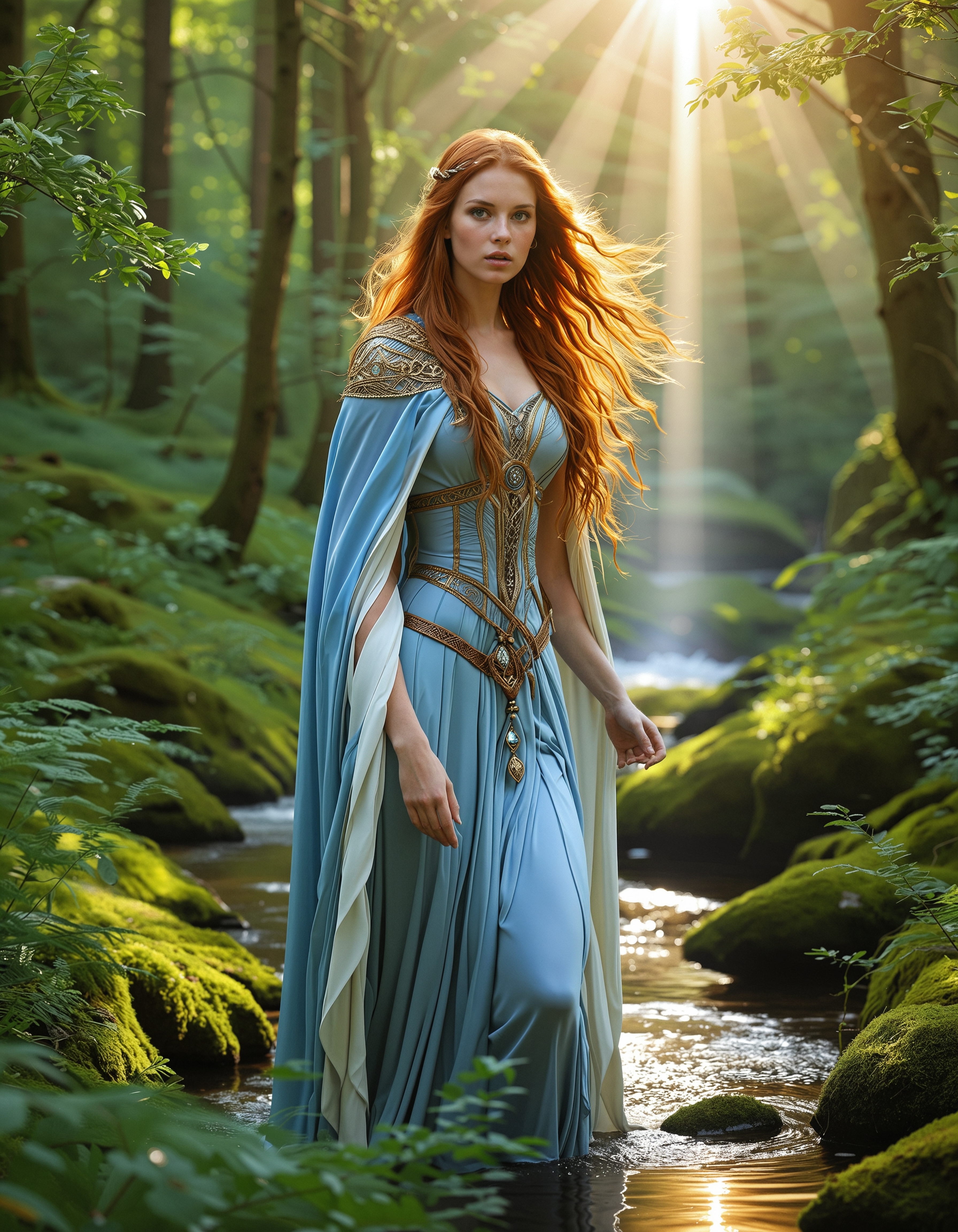 freyja, auburn hair, braided hair, magic, forest, mythic beauty, <lora:NBN-Freyja_NordicByNature:0.8>, ,Seer of the North, A mystical nbn-freyja with piercing blue eyes, draped in an embroidered cloak, predicting the future from a bowl of sacred water.,photo Fantasy art combining the styles of Boris Vellejo and Luis Royo,Photorealistic, real photo, god rays, 1girl, 21yo,realistic, clear focus, high resolution image, ,Sexy pose, erotic pose, exhibitionism, ,A serene meadow with wildflowers and a babbling brook