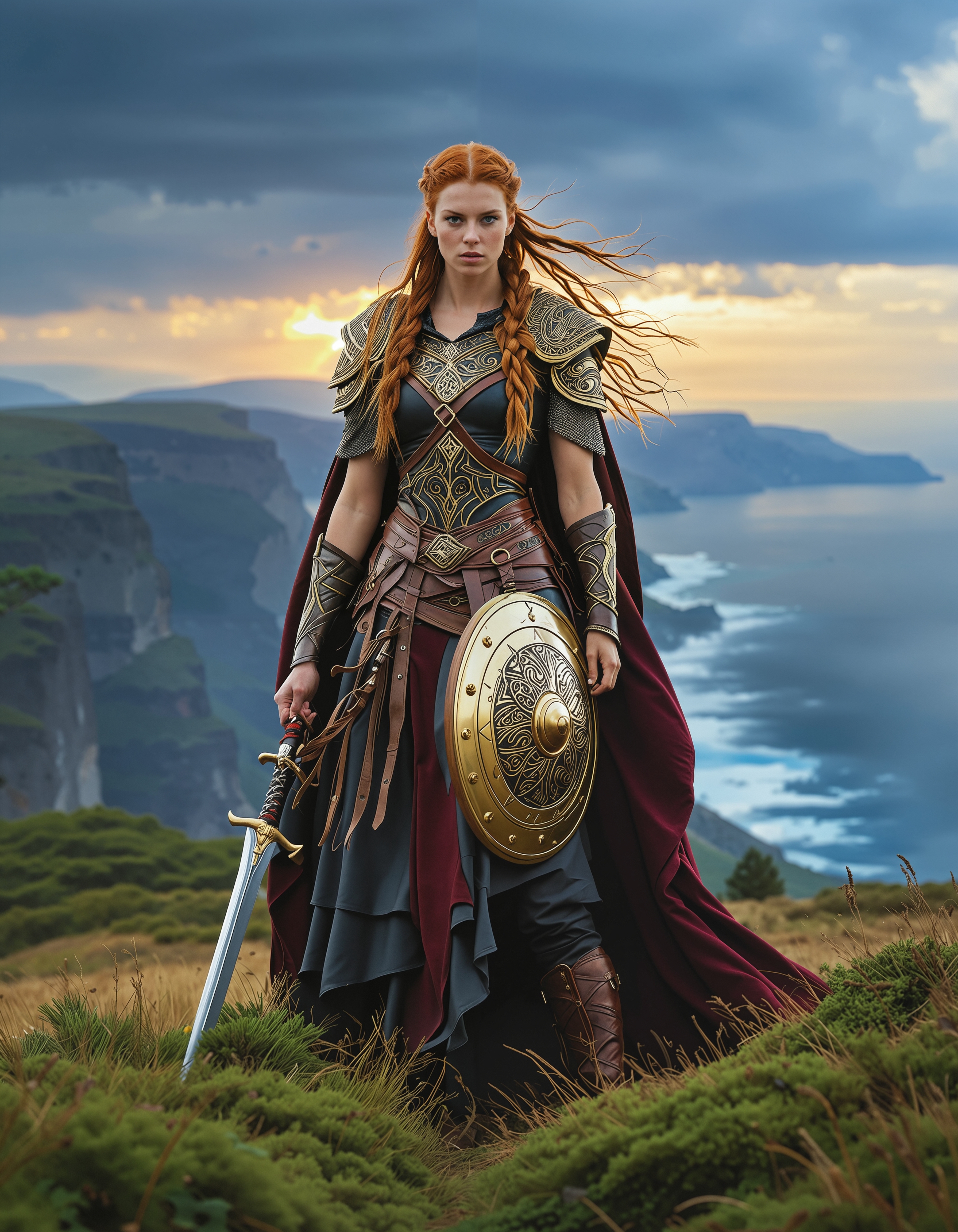 freyja, auburn hair, braided hair, magic, forest, viking queen, mythic beauty, <lora:NBN-Freyja_NordicByNature:0.8>, <lora:NordicByNature:0.8>,Shieldmaiden in Battle, A fierce Viking shieldmaiden clad in chainmail and leather armor, wielding a round wooden shield and a sharp sword. Her braided hair flows in the wind as she stands victorious on a battlefield under a stormy sky. The setting is an ancient Nordic landscape with towering fjords in the background.,low light, soft natural light, Rembrandt style light, Hasselblad DLSR camera, 200mm Zeiss lens, f/2.8, clear focus, high resolution image, ,Sexy pose, erotic pose, exhibitionism, ,The Santorini in Greece with its white-washed buildings and stunning sunsets