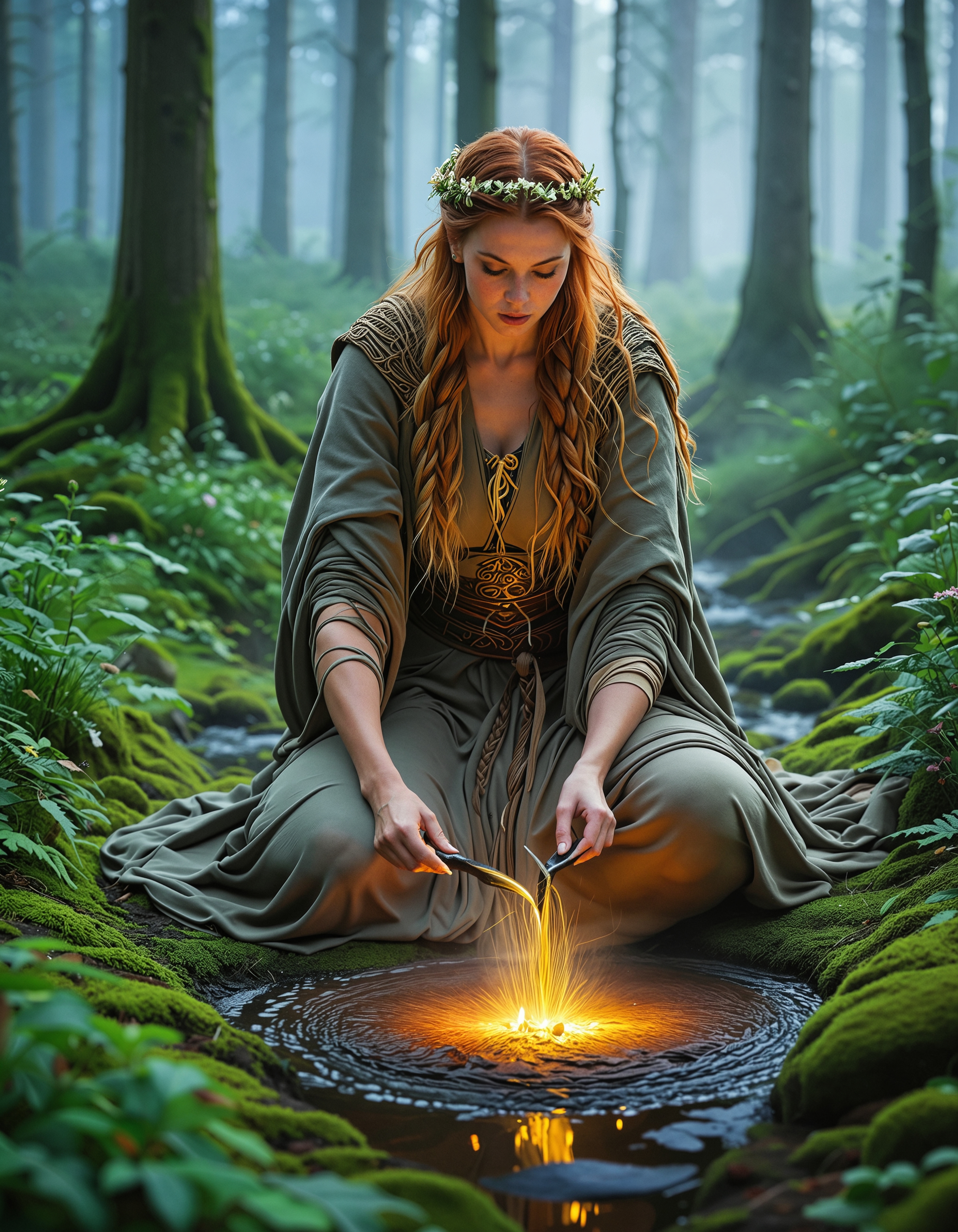 freyja, auburn hair, braided hair, magic, forest, viking queen, mythic beauty, <lora:NBN-Freyja_NordicByNature:0.8>, <lora:NordicByNature:0.8>,Runestone Carver, A nbn-freyja chiseling sacred runes into a towering stone, her weathered hands covered in dust as she works in the misty Nordic wilderness.,low light, soft natural light, Rembrandt style light, Hasselblad DLSR camera, 200mm Zeiss lens, f/2.8, clear focus, high resolution image, ,Sexy pose, erotic pose, exhibitionism, ,A tranquil garden with a pond and blooming flowers