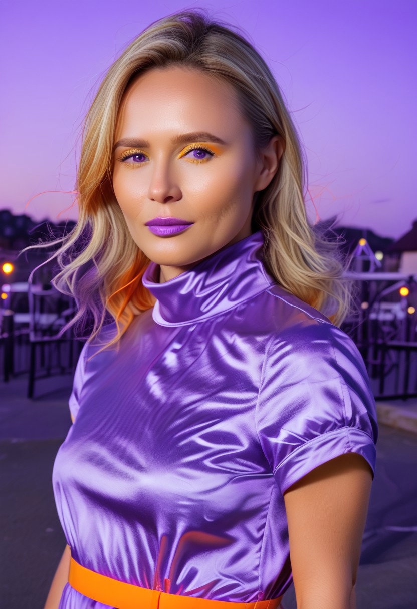 neon, wires, made of wires, cables, outlined with wires and neon, neon outlines, wire sculpture, neon wire sculpture, European women, Large breasts, long hair, blond hair, older female, score_9, score_8_up, score_7_up, score_6_up, score_5_up, score_4_up, close up, face focus, upper body, semi side view, UHD, 8K, masterpiece, detailed, ultra_high_resolution, lots of detail, OverallDetailXL, detailxl, regalres, Masterpiece, 32k, photorealistic:1.4, (small waist:2.9), fitness body, toned muscles, wide hips, slender legs, high cheekbones, oval face, 27 years old, mature female, milf, makeup, curvy, pretty face, SUPERMODEL, jewelry, solo, big bright eyes, beautiful natural eyes, fully dressed, high turtle neck, outdoors, hands hidden, short sleeves, hands behind the back, wrinkles, blonde, smiling, 1girl, blue eyes, closed dress, high neck closure, fully dressed, long dress, (neon purple:2.4), (neon orange:2.4), gentle smile,closed mouth, end_tripwire_morph, night, moon, city, playground, (neon:2.8), (wires:2.1).