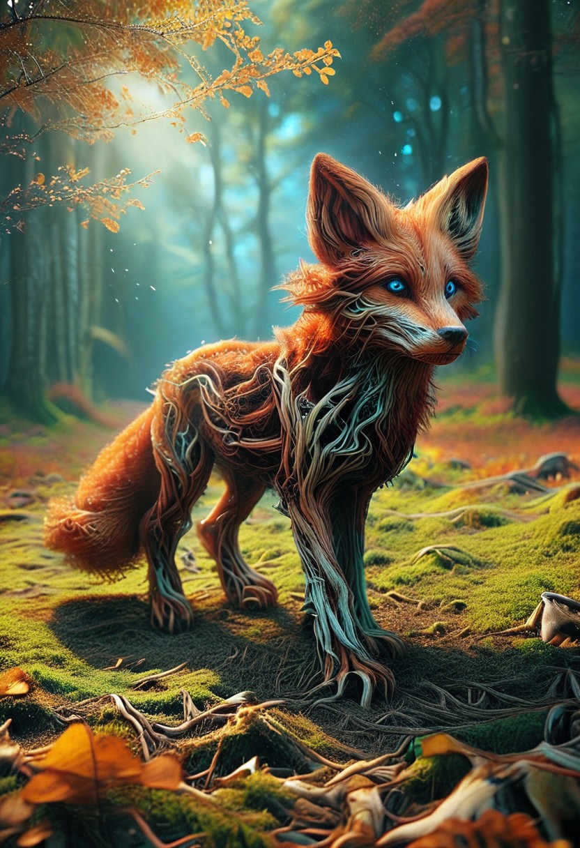 PG-TR, A striking image of a red-haired, fox-like character with blue eyes, standing in a open field next to a forest. The field is very colorful. The leaves in the background have a faint glow, creating an enchanting atmosphere. Subtle, swirling energy effects surround the character, giving a sense of power and mystique.