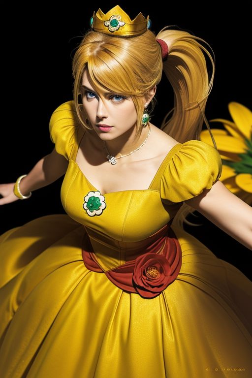 (samus aran) dressed in (puffy yellow and orange daisydress), (ponytail, hair tie), (puffy short sleeves, jewelry, dress, princess crown, flower brooch), masterpiece, best quality, 1girl, (perfect face, beautiful face, symmetric face)