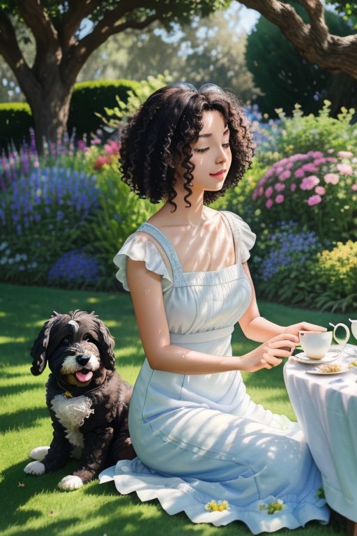 line art drawing, ligne claire, a Lady with big black curly hair at a tea party in green garden, a dog sits beside her, beautiful flower garden,Bright sunlight, sun glare, soft colours of green and blue, using water colours, wet colours, (4k quality, masterpiece), best quality,