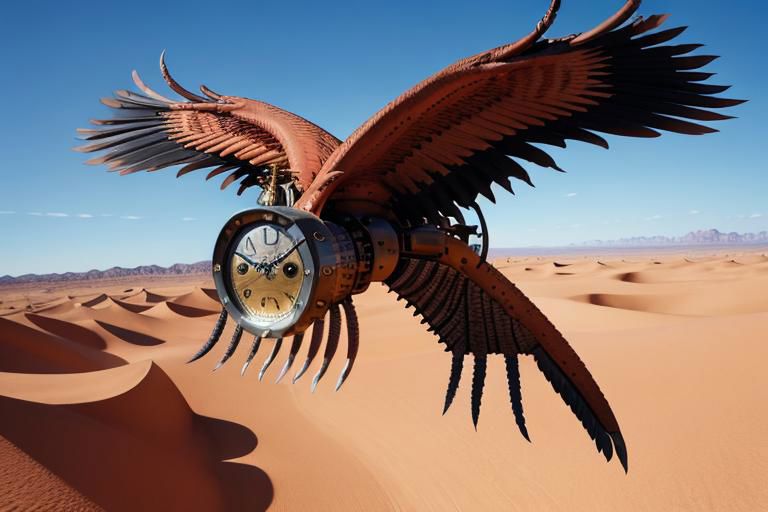 Clock with wings and talons in desert, flying higher up off the ground, unsupported