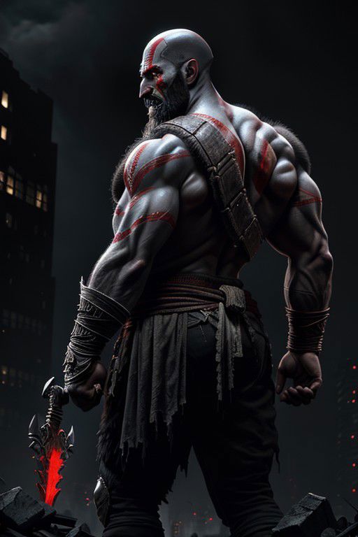 god of war,looking back at viewer,upper body,standing,bagging a black Evil Ghost Face teddy bear,against the backdrop of the (ruined city:1.1) unreal engine style of Artgerm finely detail,ultra-detailed,highres,