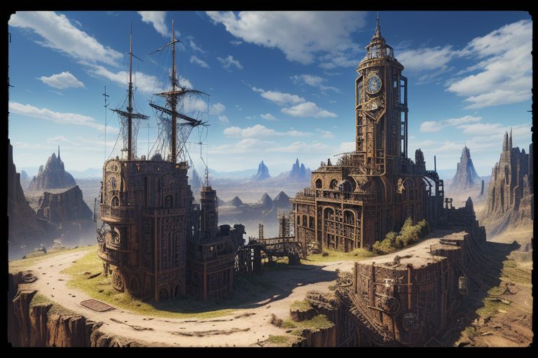 steampunk landscape, HDR, maximum clarity and sharpness, multi-layered textures, bluesky background, artstyle