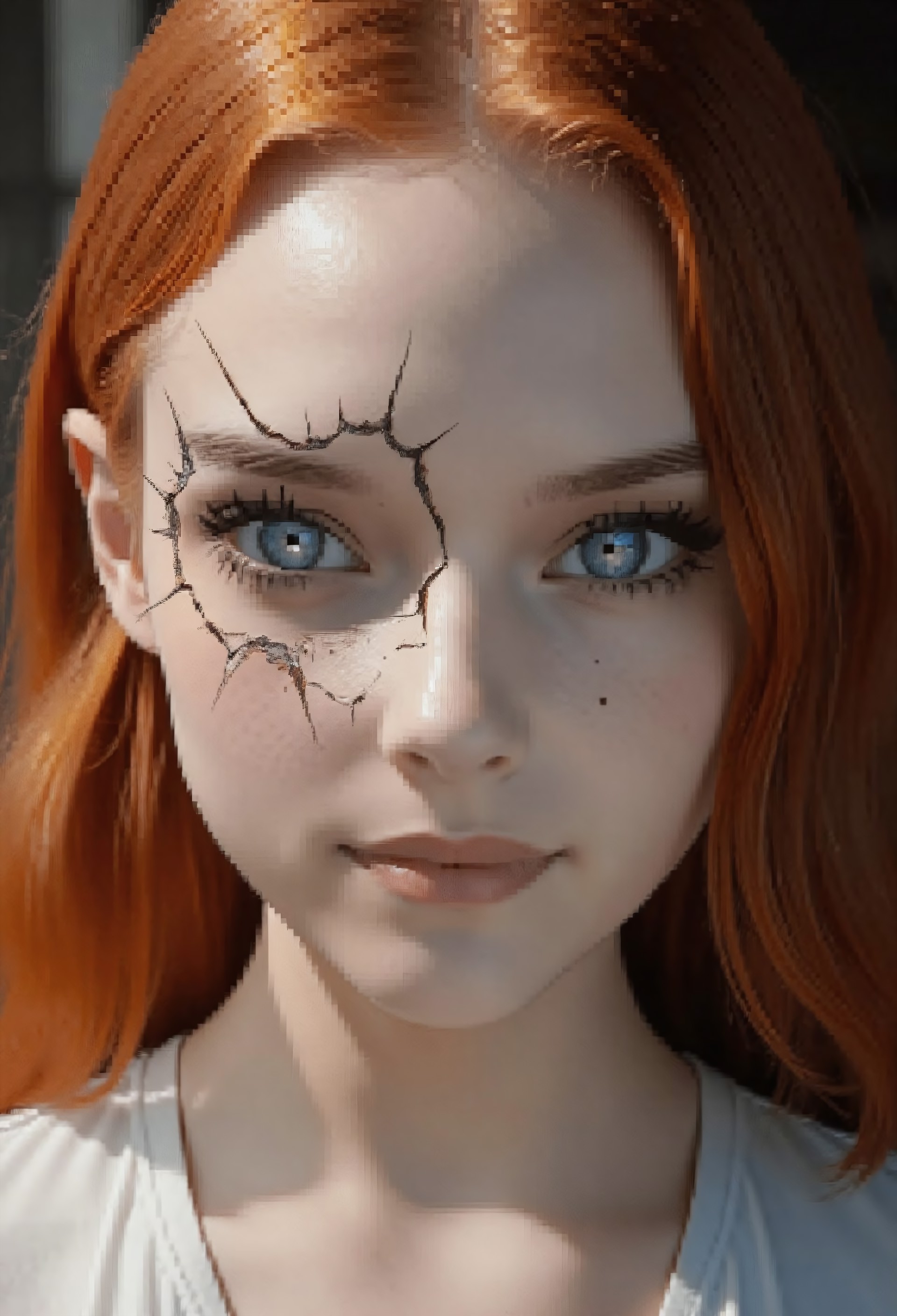 A stunning portrait of a Sleek ginger woman with striking blue eyes, soft natural lighting, intricate skin details, delicate freckles, 85mm f/1.4 DSLR photography, realistic depth of field, cinematic composition, HDR, ultra-sharp focus. Breaking the fourth wall theme. Cracked vision as if someone has beaten the camera lens. Trying to break through the invisible barriers between realities in order to get to viewer, cracked but still fully on her own side.