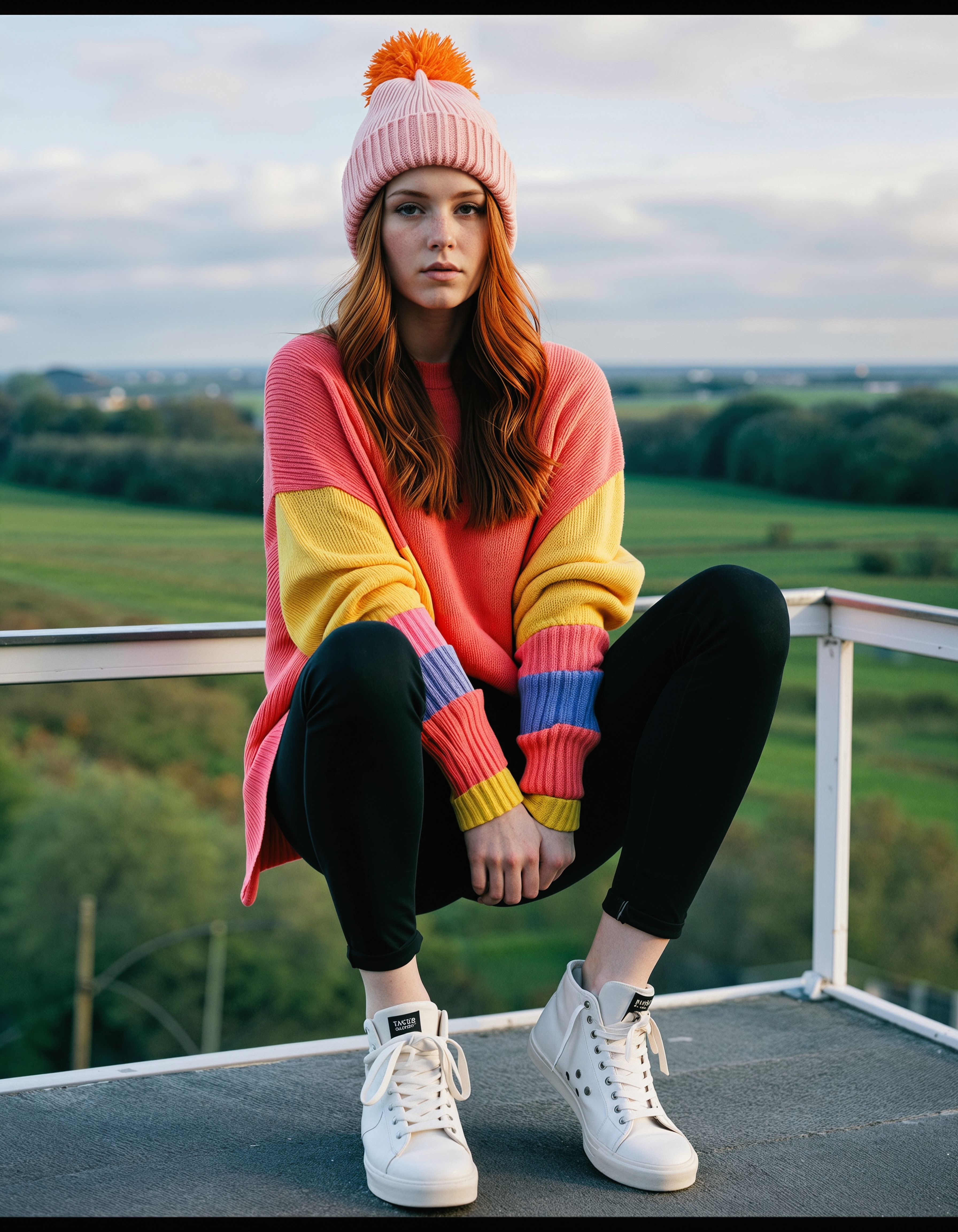 RAW full body analogue photo of a beautiful 25 years old woman, clear focus, high resolution image, pale skin (Auburn-hair Irish woman), ,wearing Punk with a Pop of Color, a bright oversized sweater, black jeans, and colorful high-top sneakers. Features a beanie and colorful wristbands, ,,low light, soft natural light, Rembrandt style light, Hasselblad DLSR camera, 200mm Zeiss lens, f/2.8, ,Sexy pose, erotic pose, exhibitionism, ,observatory terrace
