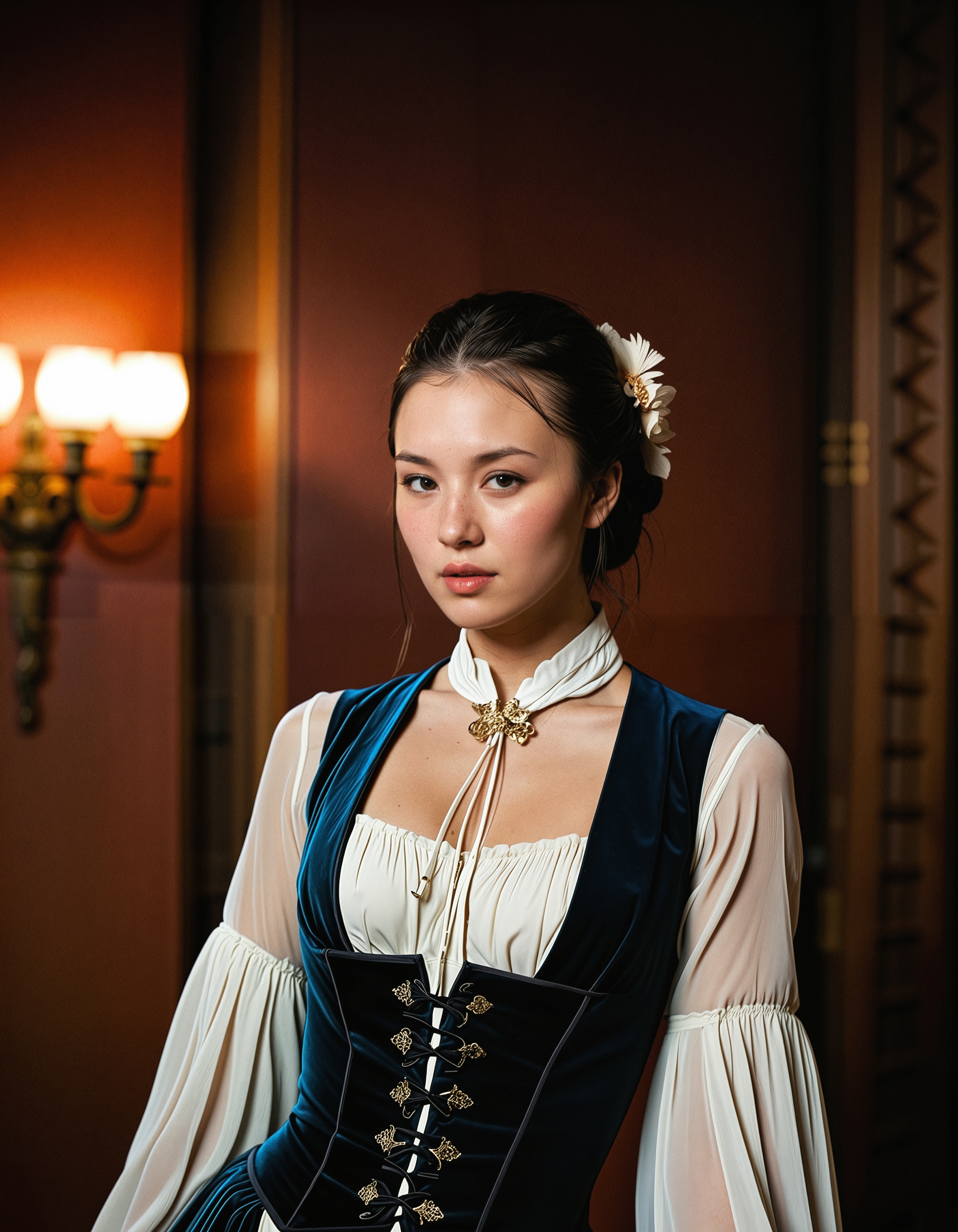 RAW full body analogue photo of a beautiful 25 years old woman, clear focus, high resolution image, Asian woman, dark hair, <lora:Ai_Lotus:0.75>,, ,wearing A velvet frock coat layered over a high-neck chiffon blouse and a pleated skirt. Add lace stockings, platform boots, and a silk cravat. Finish the look with a pocket watch and a feathered hairpin, (braided hair:1.3),,low light, soft natural light, Rembrandt style light, Hasselblad DLSR camera, 200mm Zeiss lens, f/2.8, ,Sexy pose, erotic pose, exhibitionism, ,Abandoned theater