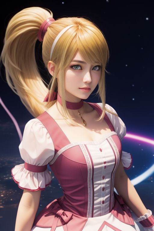 (samus aran) dressed in (puffy pink kanamemadokaoutfit), (ponytail, hair tie), magical girl, masterpiece, best quality, (perfect face, beautiful face, symmetric face)