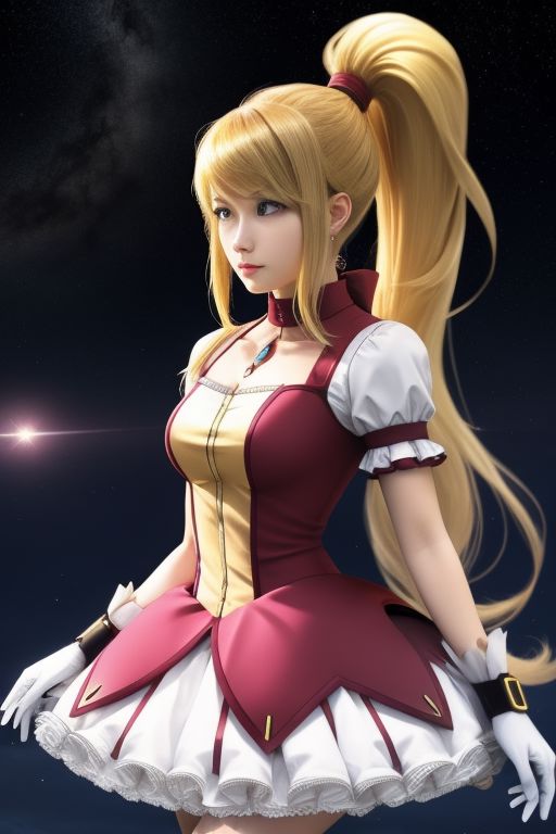 (samus aran) dressed in (puffy kanamemadokaoutfit), (ponytail, hair tie), magical girl, masterpiece, best quality, (perfect face, beautiful face, symmetric face)
