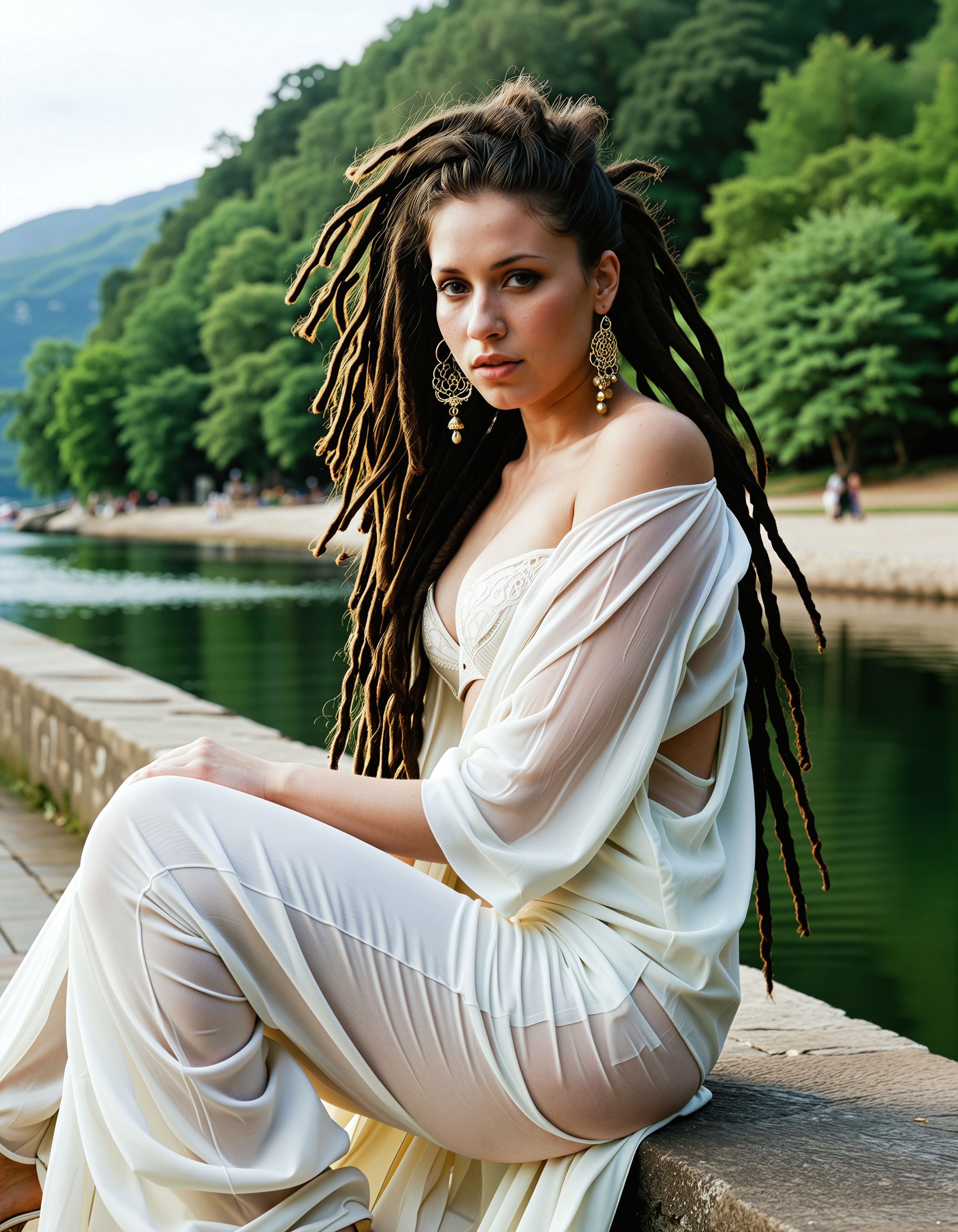 RAW full body analogue photo of a beautiful 25 years old woman, clear focus, high resolution image, Rebecca Raven beautiful woman with dark hair and (pale skin), <lora:Rebecca_Raven_SDXL_V3:0.6>,, ,RAW full body analogue photo of a beautiful 25 years old , high resolution image, Wearing traditional Indian clothes ((Salwar Kameez)), Natural hair, low light, soft natural light, Rembrandt style light, Hasselblad DLSR camera, 200mm Zeiss lens, f/2.8, Camerera view low-angle shot ,Sexy pose, erotic pose, exhibitionism ,Waterfront promenade, (dreadlocks:1.3),,photo Fantasy art combining the styles of Boris Vellejo and Luis Royo,Photorealistic, real photo, god rays, 1girl, 21yo,realistic, ,Sexy pose, erotic pose, exhibitionism, ,mountain monastery