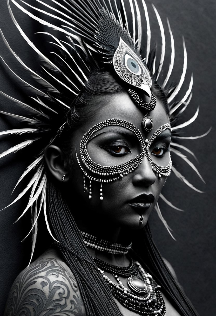 A beast made of writhing shadows and molten metal, with empty eye sockets that bleed black mist, 3D art, minimalist, ink drawing, graphite texture, rough cotton paper, monochrome, tribal portrait, detailed beadwork, feathers, face paint, subtle elegance, organic lines, cultural elements, textured surface, understated beauty, refined, traditional adornment, artistic realism, timeless composition