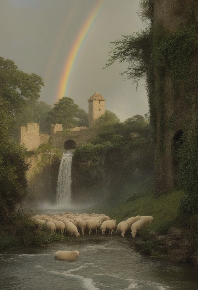 John Constable (tonal realism), Chalk downs with grazing sheep flocks, rainbow in waterfall mist, stone watchtower with ivy-covered walls,lapwing performing display.,Art painting by Eiichiro Oda and Tooth Wu , featured on Ashley Wood,, artstation trending, macro lens, volumetric light, <lora:Illustration_Insanity:0.3>, <lora:dreamshaperXL10_lora:0.7>, <lora:extremely_detailed:0.3> extremely detailed, <lora:DetailMaximizer:0.3>,, Surrealism art style, dreamlike and irrational imagery, explores the unconscious mind, juxtaposition of unlikely elements, challenges reality and logic