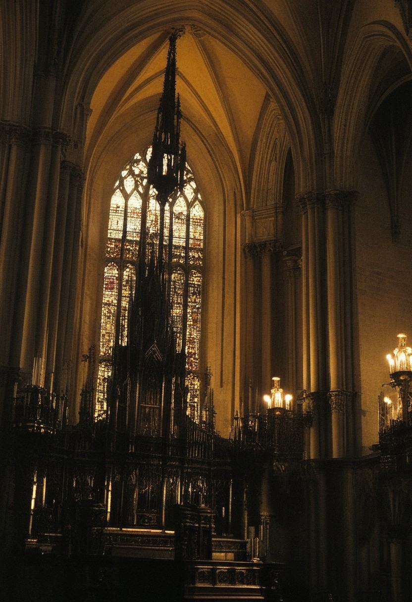 illuminated Photo, close up, no humans, evening with golden hour lighting, professional grade, dark Gothic, Studio lighting. Photo realistic, Natural atmospheric lighting, intricate details, 35mm photograph, film, professional, 32k visuals, highly detailed, elegant, studio quality, cathedral