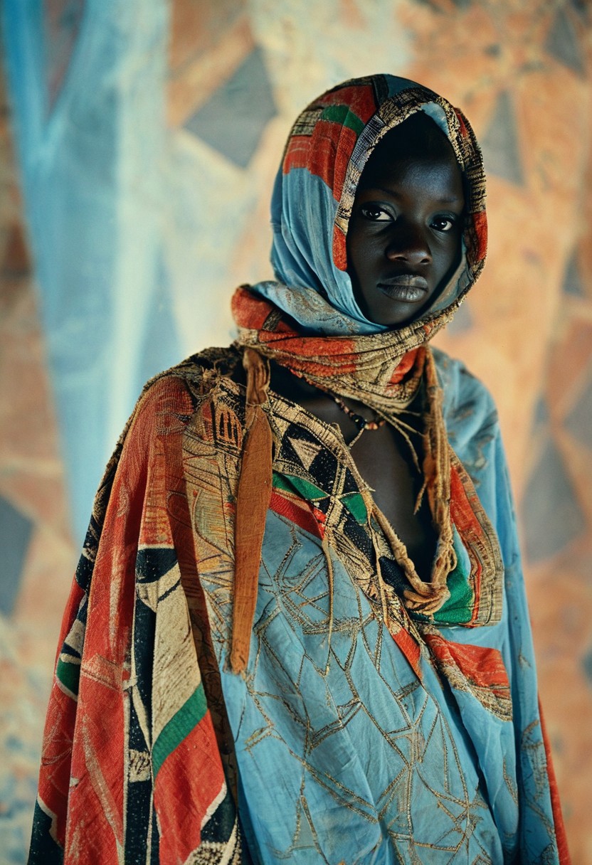 film photography, masterpiece, diffused (indoor) natural light, award winning photo, Ektachrome 200 film, ({full view|hips view|ass focus}), shot on 50mm lens at f/2.0 aperture, photorealistic, 8K highest Definition, soft light, warm light, (dreamy:1.2), muted colors, a kenyan mulato ancient, cloaked female figure with piercing eyes, their face wrapped in kenyan flag fabric adorned with extremely intricate hieroglyphs, set against an abstract, polygonal blue gradient background. The cloth appears worn and frayed, with strands of cobwebs catching the light, evoking a sense of age and decay. The background’s geometric facets shift from light to dark blue, creating a sense of depth that feels cold and detached, as if the figure exists within a frozen, digital void. Every wrinkle, stitch, and symbol on the fabric is detailed, revealing a story etched into the cloth. The icy blues of the background offer a stark contrast, amplifying the figure’s ancient aura. This composition weaves together themes of antiquity and futurism, drawing the viewer into a world where the past is preserved within a crystalline digital space.