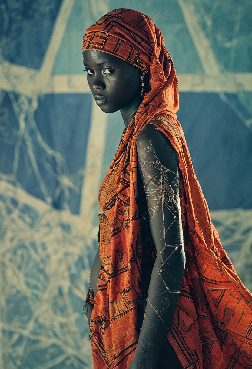 film photography, masterpiece, diffused (indoor) natural light, award winning photo, Ektachrome 200 film, ({full view|hips view|ass focus}), shot on 50mm lens at f/2.0 aperture, photorealistic, 8K highest Definition, soft light, warm light, (dreamy:1.2), muted colors, a kenyan mulato ancient, cloaked female figure with piercing eyes, their face wrapped in kenyan flag fabric adorned with extremely intricate hieroglyphs, set against an abstract, polygonal blue gradient background. The cloth appears worn and frayed, with strands of cobwebs catching the light, evoking a sense of age and decay. The background’s geometric facets shift from light to dark blue, creating a sense of depth that feels cold and detached, as if the figure exists within a frozen, digital void. Every wrinkle, stitch, and symbol on the fabric is detailed, revealing a story etched into the cloth. The icy blues of the background offer a stark contrast, amplifying the figure’s ancient aura. This composition weaves together themes of antiquity and futurism, drawing the viewer into a world where the past is preserved within a crystalline digital space.