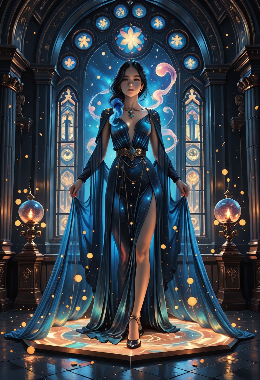 masterpiece, absurdres, 8k, HQ, celestial woman, stained glass portal, flowing aquamarine gown, cosmic backdrop, glowing ethereal light, divine elegance, fantasy realism, intricate filigree, interstellar aura, rococo structure, atmospheric lighting, luminous hair, high detail, 16k, hdr, cinematic fantasy, digital painting, Jean-Baptiste Monge, Artgerm, WLOP