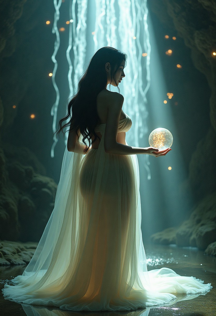 (Soft Lighting Photography by Mimoza Veliu and Mario Giacomelli:1.2), NSFW, A sexy woman caught in a moment where time has stilled, yet everything around her pulses with latent energy. Her form is both grounded and weightless, as if she is the axis upon which a surreal world turns. The composition blends classical elegance with futuristic mysticism, creating an image that feels like myth reborn through digital dreams. A single source of light emanates from just above and behind her, casting a soft halo effect that outlines her silhouette in silver. This divine glow interacts with the scene in unusual ways: it refracts through floating glass petals suspended mid-air, creates prismatic flares on her skin, and illuminates translucent veils of gossamer fabric that drift like smoke around her. their branches blooming with neon orchids that pulse rhythmically like heartbeats. Behind her, a waterfall flows upward into a mirrored ceiling, \ She stands in quiet equilibrium, feet rooted yet subtly lifted as if gravity hesitates to claim her. Her posture is regal, spine straight, shoulders relaxed, arms slightly outstretchedânot for balance, but as if conducting unseen forces. Her right hand cradles a sphere of swirling mercury; her left fingers are splayed open, allowing threads of golden energy to weave between them like lightning held captive. Her hair flows gently, not with wind but with an internal rhythm, each strand ending in a tiny bead of glowing crystal.