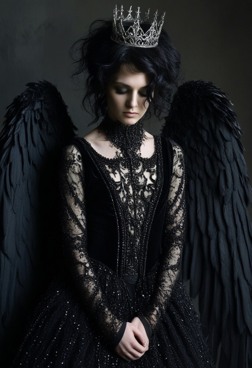 This is a highly detailed, dark, and gothic-themed photograph capturing a striking, androgynous figure with a blend of human and angelic features. The subject, likely a trans or gender-nonconforming person, stands with a melancholic expression, their gaze directed downward. They have a slender, athletic build with small to medium-sized breasts, and their skin appears pale and ethereal in the dim lighting. Their wavy hair cascades around them, styled in an otherworldly, unkempt manner. They are adorned with intricate, dark, almost black wings that resemble those of a fallen angel, with feathers detailed in a fine, textured way that catches the soft, shadowy light. A delicate, ornate crown made of dark, possibly blackened, metal adorns their head, adorned with small, glowing orbs that hint at an ethereal presence. The figure wears an elaborate, dark, flowing gown that appears to be made of a material that blends dark velvet and a shimmering, possibly metallic fabric, with intricate, ornate patterns that evoke a sense of gothic decadence. The gown drapes dramatically, revealing an ethereal, almost ghostly quality.