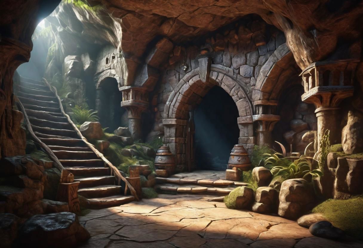 fantasy and D&D style, cave entrance hall to a dungeon system, 64k photorealistic HDR